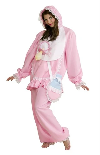 Baby Kostüm in rosa für Erwachsene. Hochwertig verarbeitetes Baby Faschingskostüm für Erwachsene. Auch erhältlich für Kinder. Das Kostüm enthält eine Hose, eine Bluse mit Kapuze und ein Lätzchen.